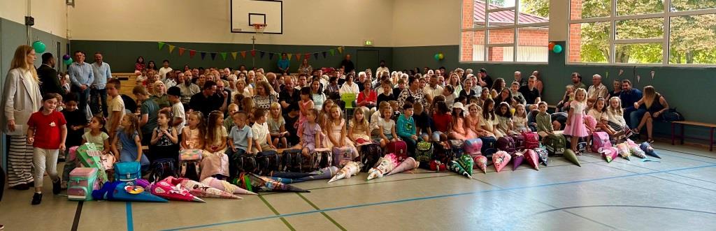 Gleich nach den Sommerferien haben wir unsere neuen Erstklässler eingeschult. Nach einem Programm in der Turnhalle, bei dem Geschwisterkinder und Klassen die Kinder begrüßt haben, besuchten die Kinder ihre erste Unterrichtsstunde.